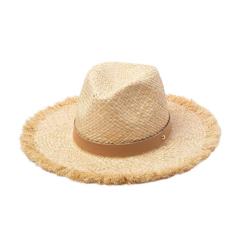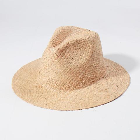 หมวกราฟเฟียธรรมชาติทรงปานามาพร้อมหัวเข็มขัดหนังป้องกันรังสียูวีสำหรับทั้งชายและหญิงหมวกแต่งงานริมชายหาดฤดูร้อน